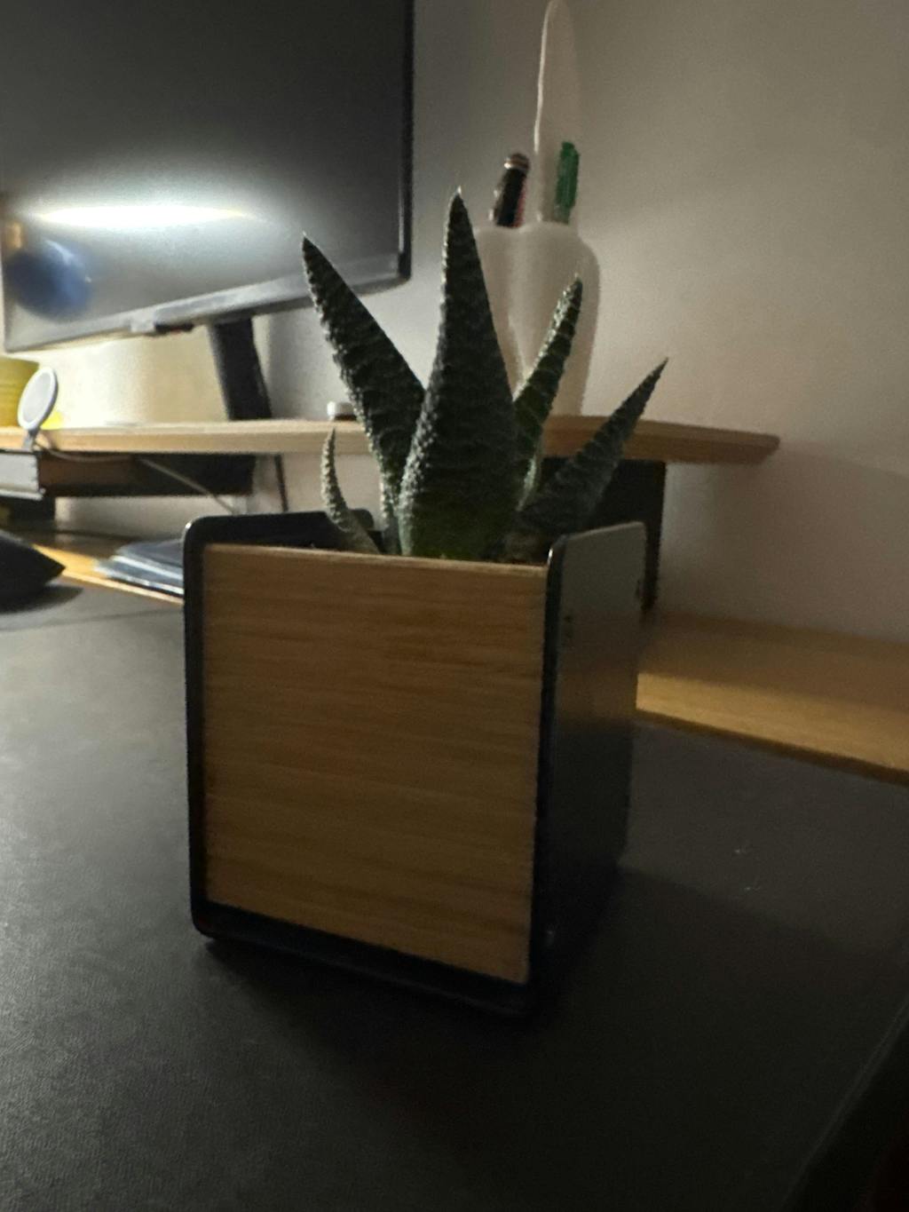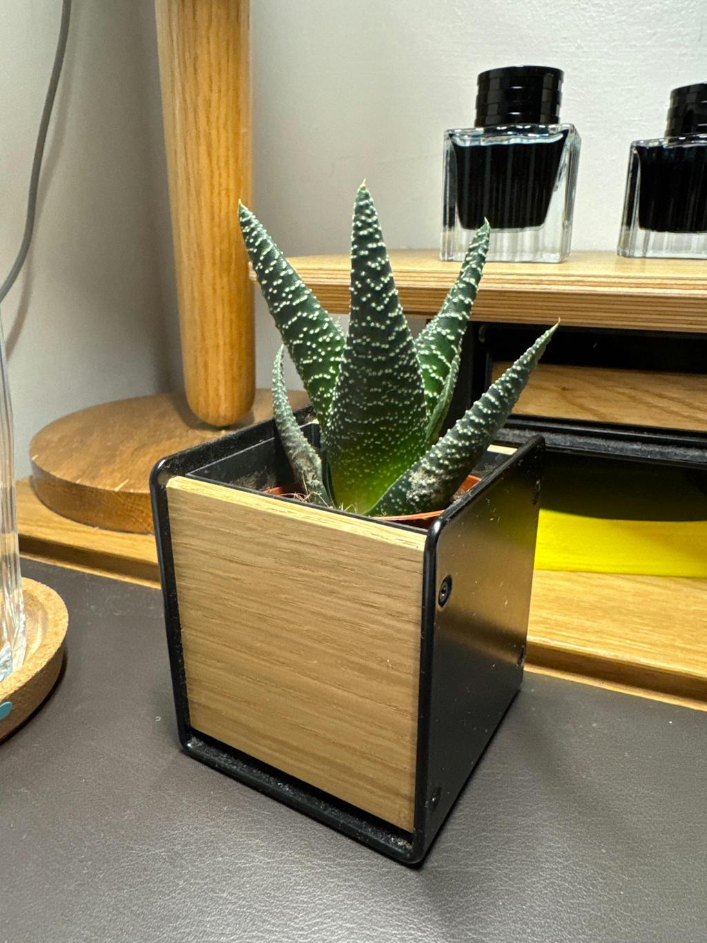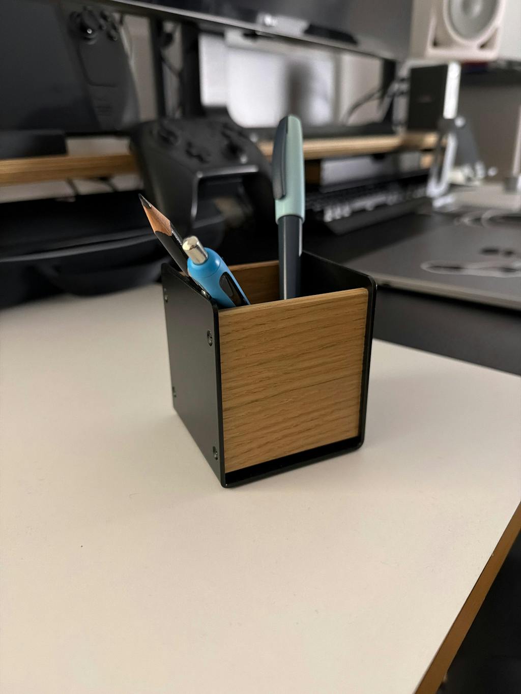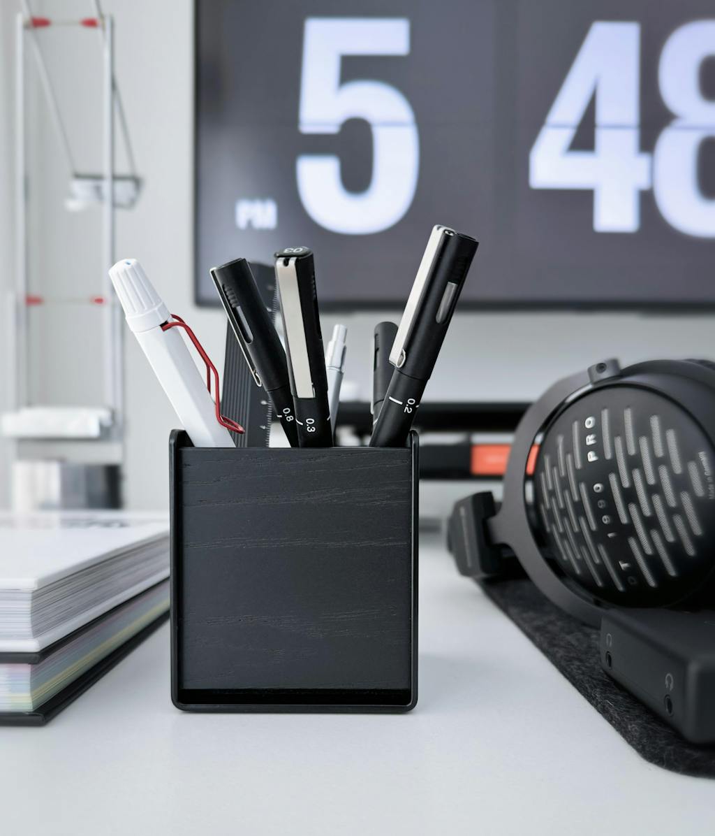 Der Stifthalter sorgt mit Leichtigkeit für mehr Ordnung auf jedem Schreibtisch. Das Zusammenspiel aus schwarzem Stahl und Holz vereint mühelos Funktionalität und Ästhetik. Eine simple und edle Lösung, um Ordnung auf dem Schreibtisch einziehen zu lassen und Stifte und Kugelschreiber immer zur Hand zu haben.