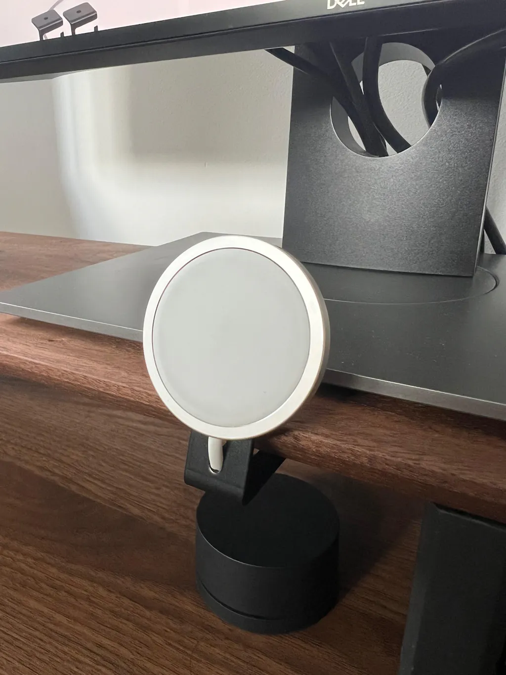 The MagSafe Holder for the Setup Cockpit positions the iPhone at a user-friendly height and angle during wireless charging. After mounting the holder to the monitor stand, the Apple MagSafe Charger is attached to the support surface with the enclosed 3M adhesive pad.