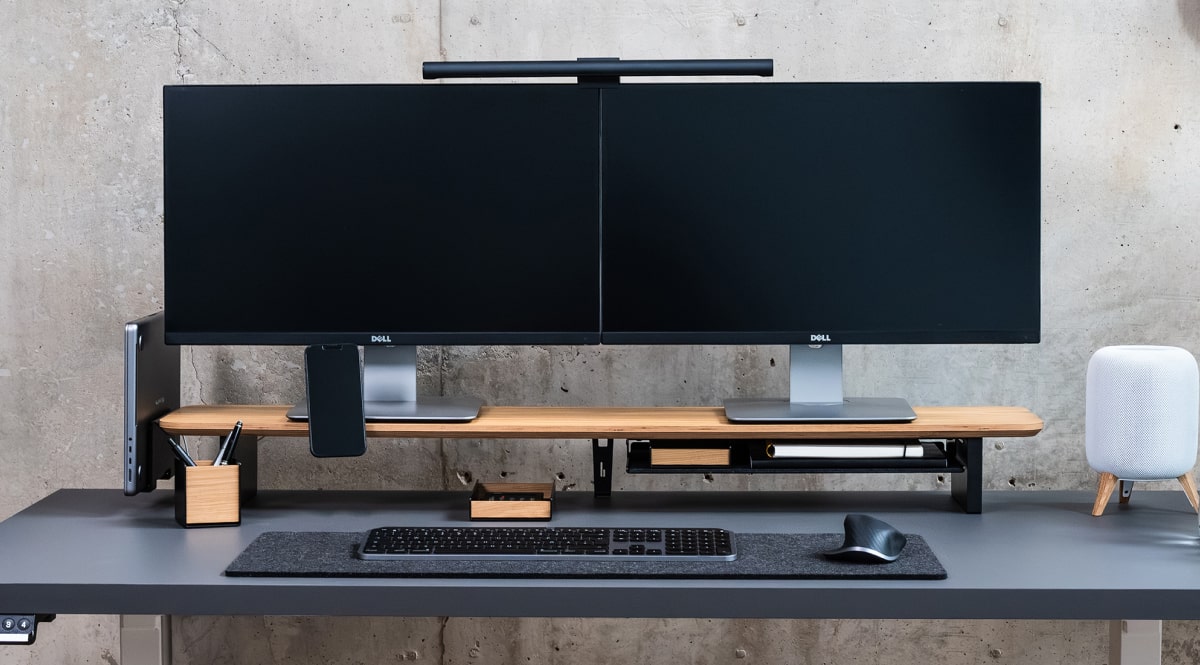 The BALOLO® Setup Cockpit is a modern monitor stand, elevating up to two screens to an ergonomic height and creating the perfect combination out of functionality and aesthetics. Manufactured in a minimalist design, the desk shelf immediately becomes the centerpiece of every desk setup and takes structure and organization to a new level.