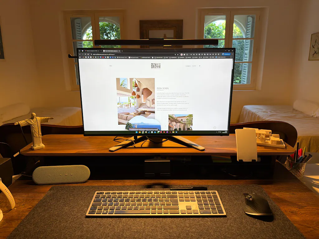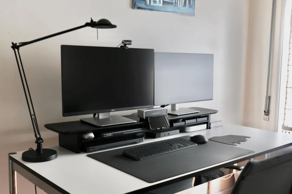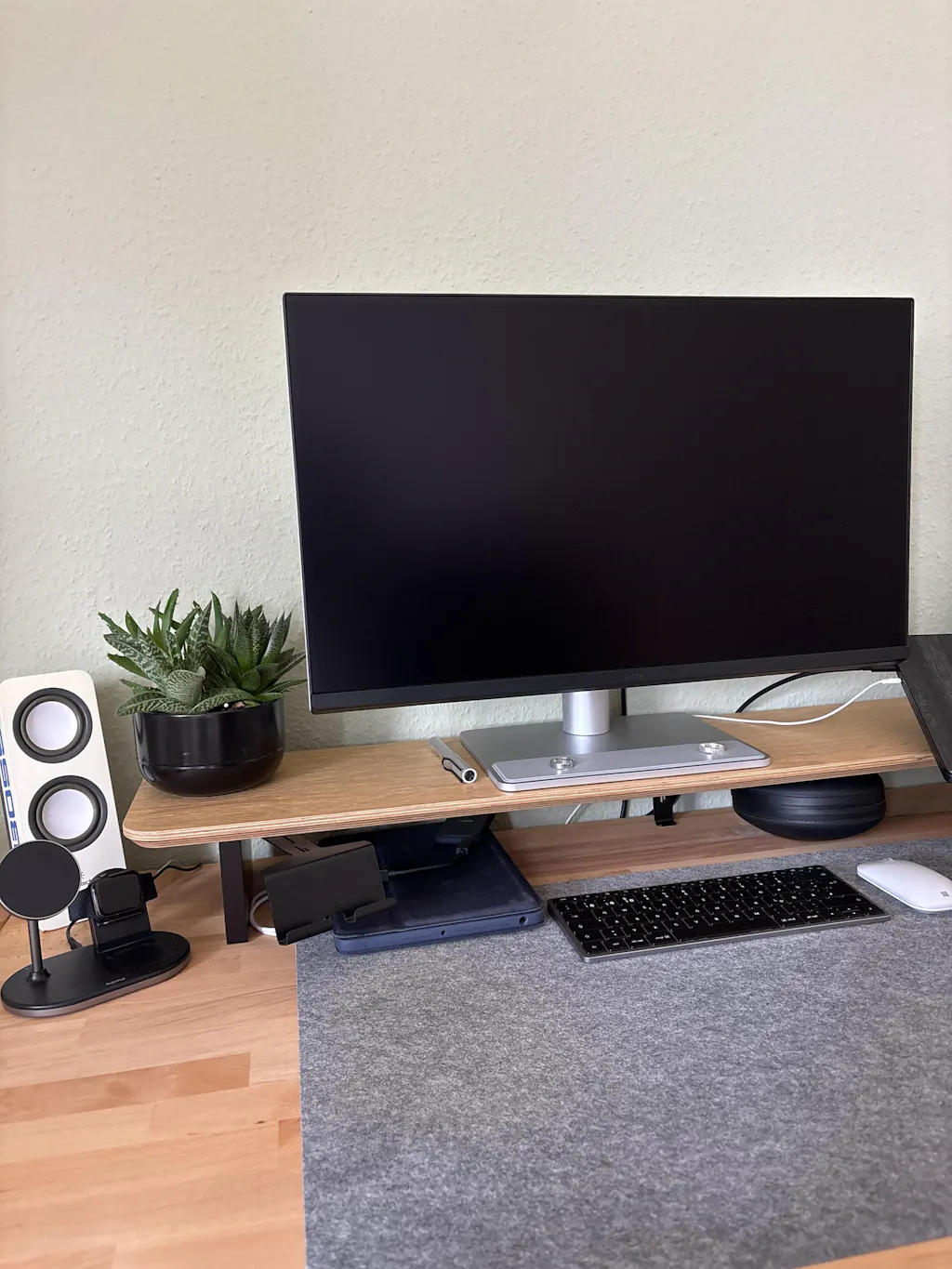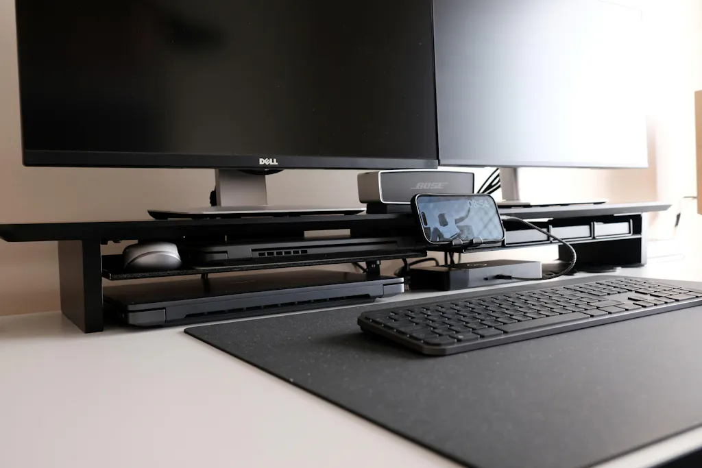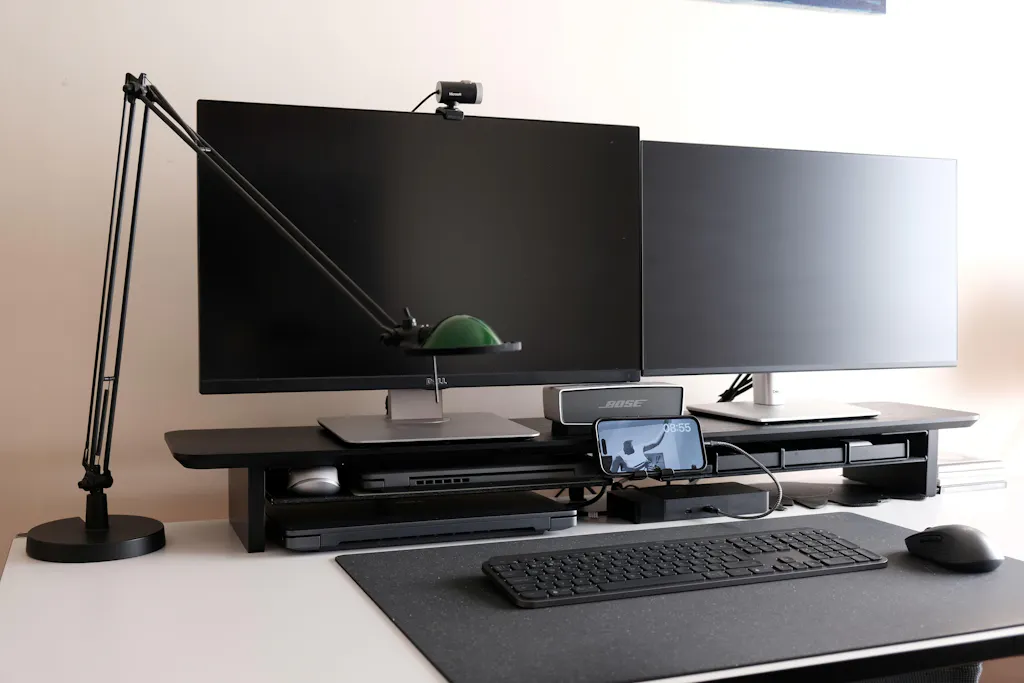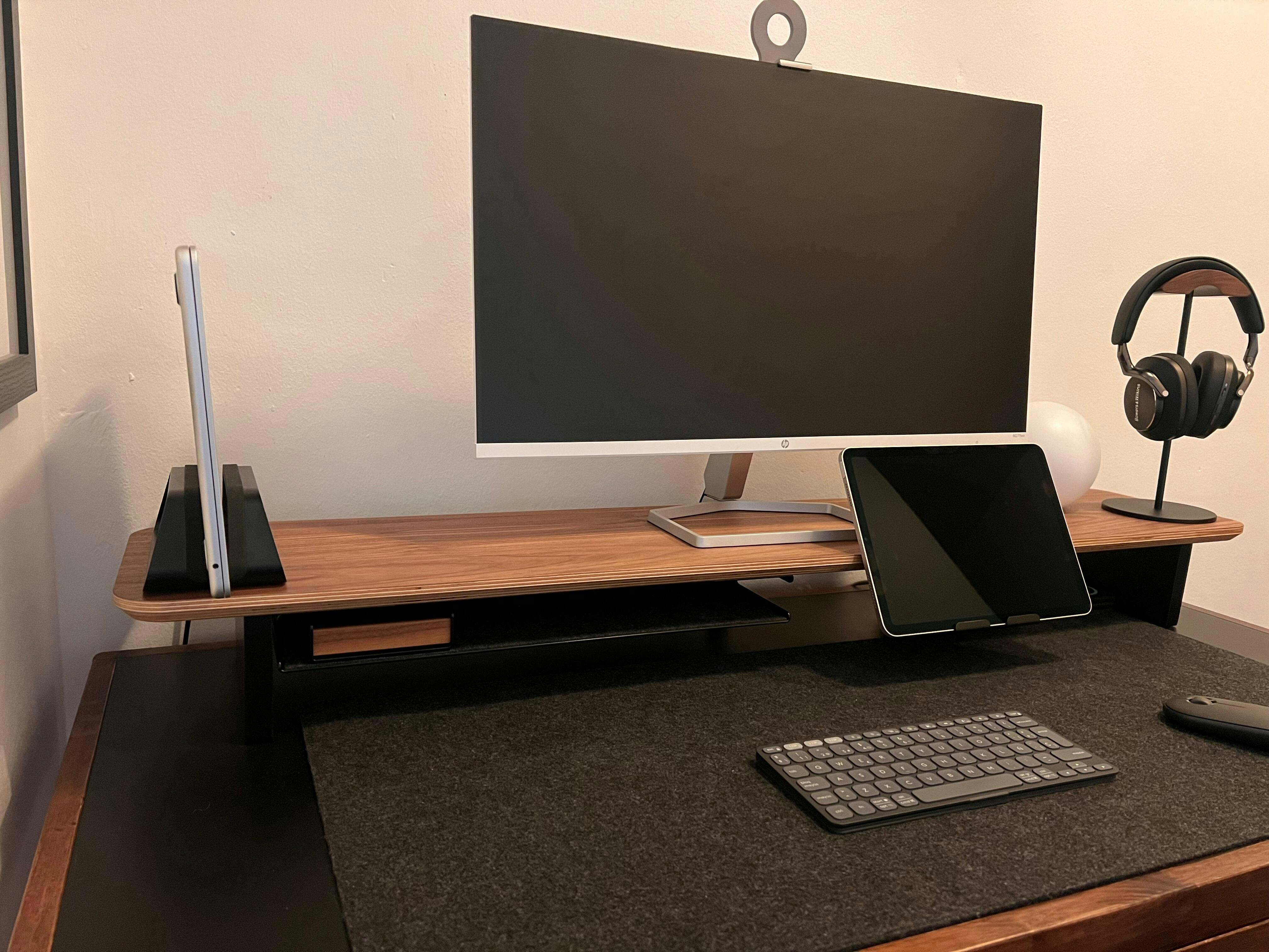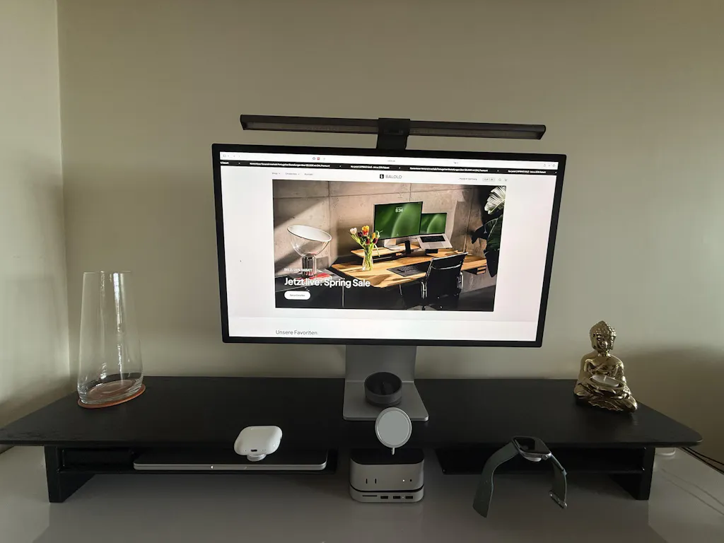 The BALOLO® Setup Cockpit is a modern monitor stand, elevating up to two screens to an ergonomic height and creating the perfect combination out of functionality and aesthetics. Manufactured in a minimalist design, the desk shelf immediately becomes the centerpiece of every desk setup and takes structure and organization to a new level.