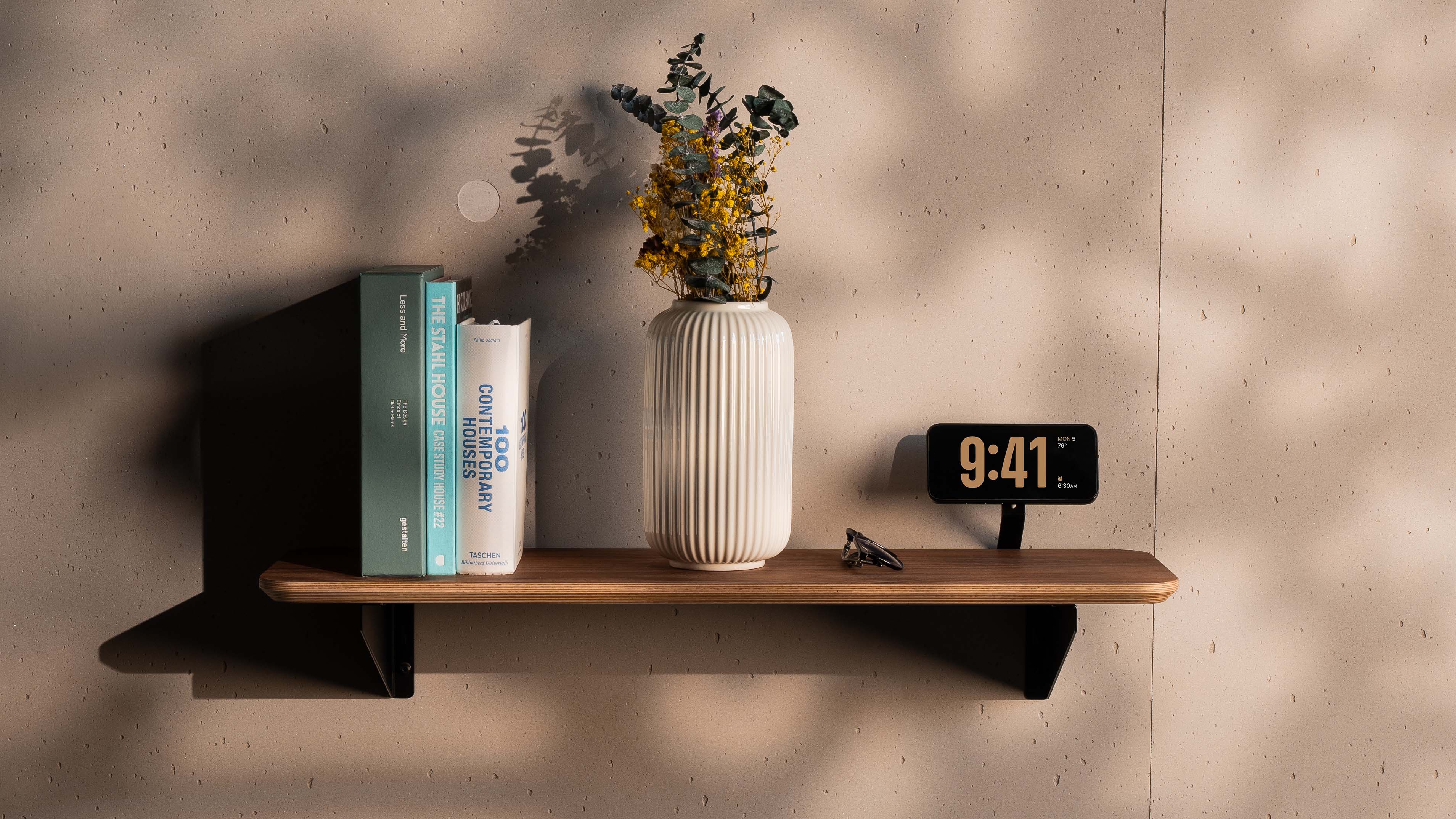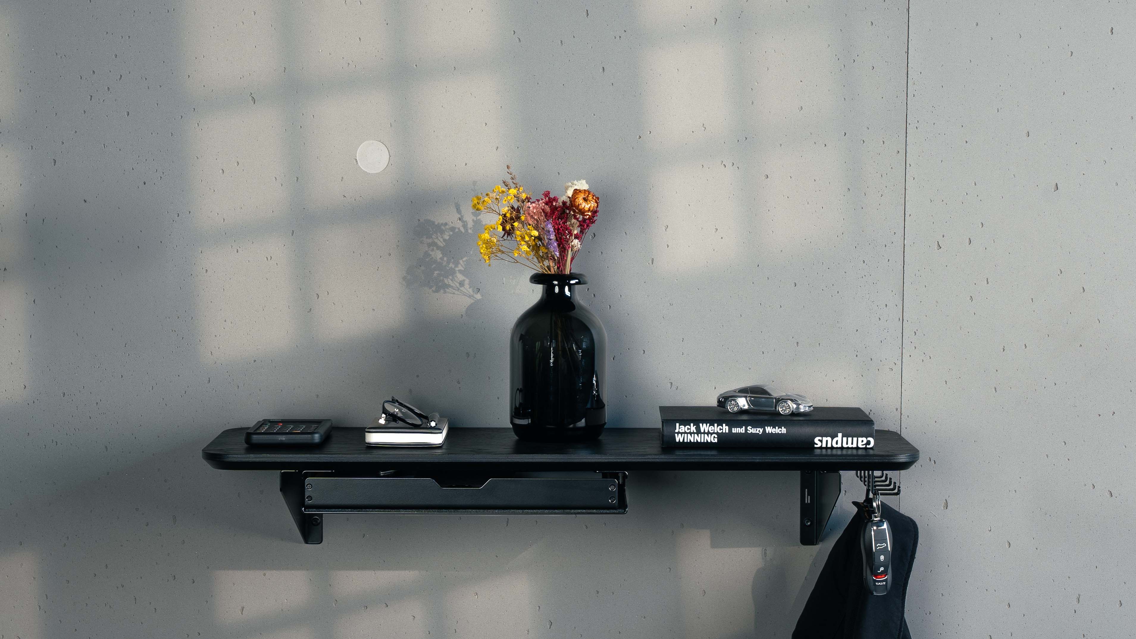 The functionality of the Wall Cockpit is perfected by a range of modular accessories. These can be individually attached to the mounting points of the patent pending mounting grid on the underside. This allows not only everyday objects such as books, keys or decorative stands to be optimally arranged. Even electronic devices such as the iPhone or Apple Watch can be perfectly integrated into the room.