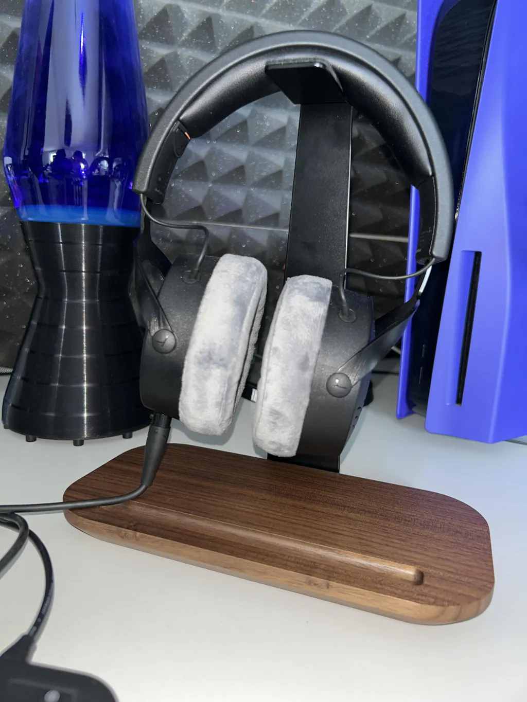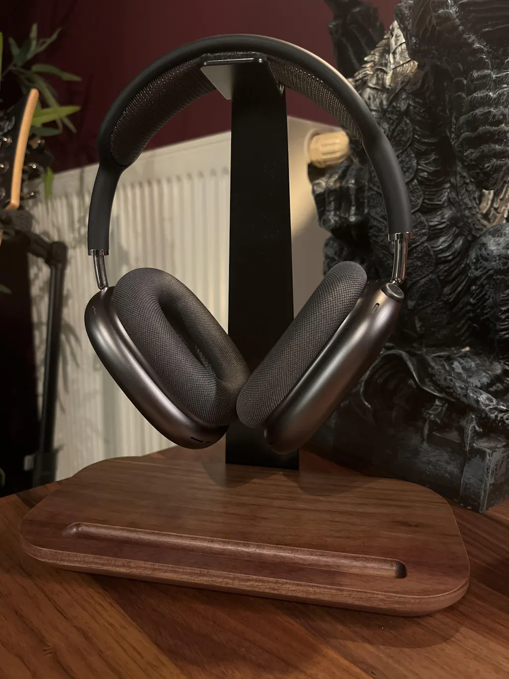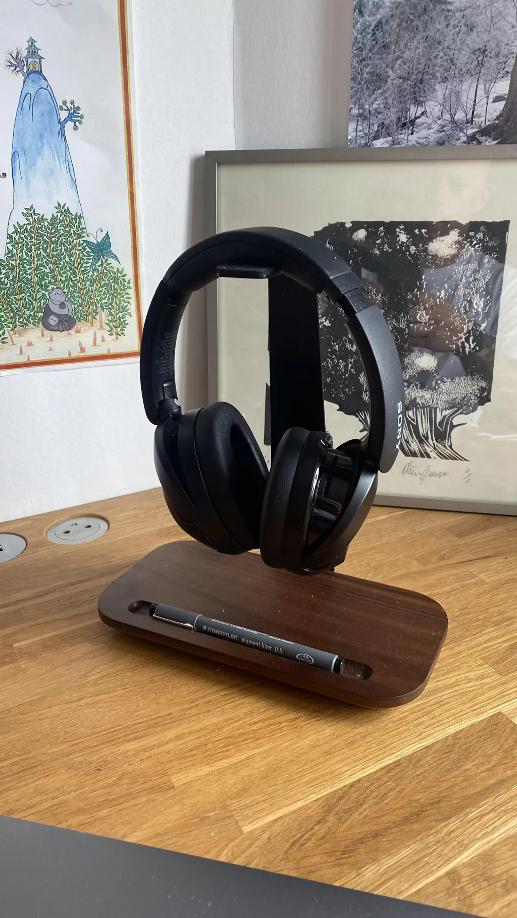 Der Kopfhörerständer aus amerikanischem Nussbaumholz / Eichenholz ist der perfekte Aufbewahrungsort für Kopfhörer und Headset. In minimalistischem Design wird er zum Statement auf jedem Schreibtisch, das die Kopfhörer nur einen Handgriff entfernt geordnet bereithält.