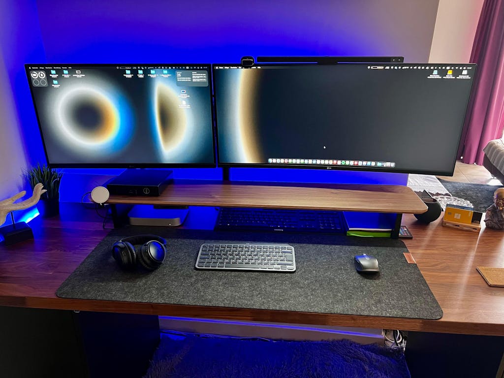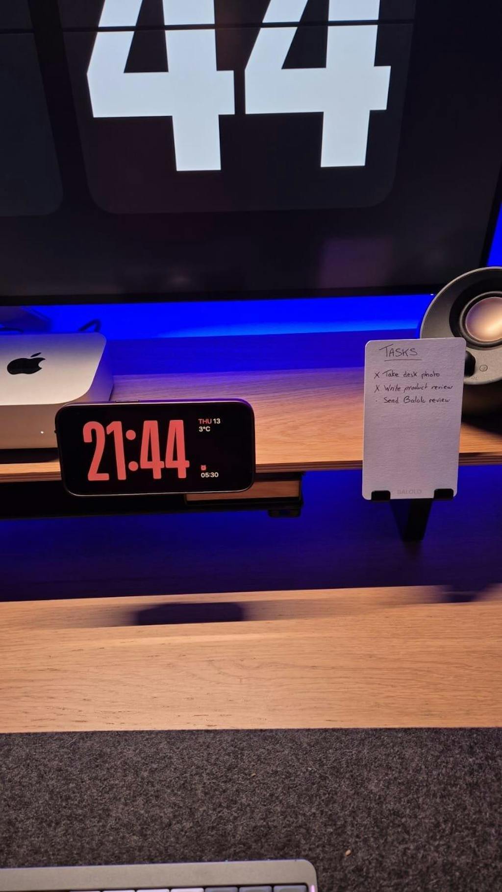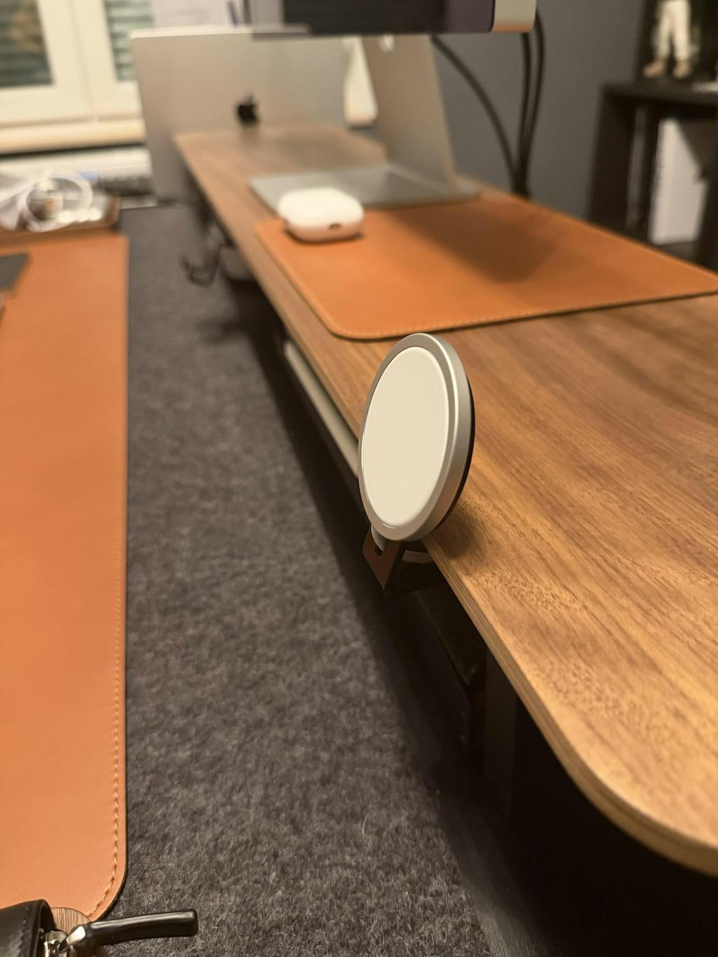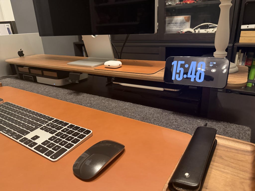 Die MagSafe Halterung für das Setup Cockpit bringt das iPhone während des kabellosen Ladens auf eine nutzerfreundliche Höhe, sodass es sich angenehm bedienen lässt. Die Halterung wird hierfür an der Monitorerhöhung angebracht und der Apple MagSafe Charger mit dem beiliegenden 3M Klebepad an der Auflagefläche befestigt.